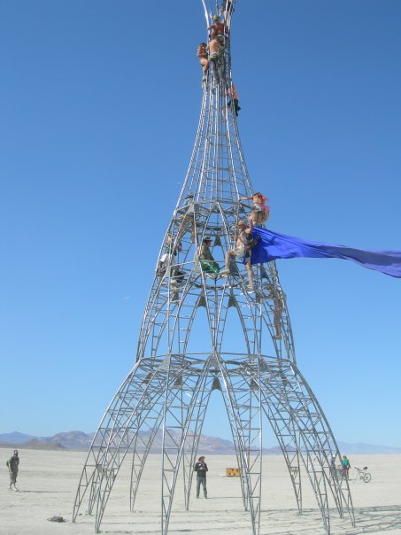 For years my friends tried to get me to Burning Man but didn't see the need. A desert event that falls between Dead Heads and Goth filled with fun, naked people and technology types? Why didn't I go? Too busy; then, tickets, ride and prime real-estate camp site opened led by two dear friends Danielle and Daniel a week before so I went. I heard Obama had to sell his tickets for security issues. Tradition is to bring something of value and share it. That's me with the 30' flag from my last wedding structure; climbing to the top and blowing in the wind on top the tower. Royalty Flag; in honor of my ex and new life!